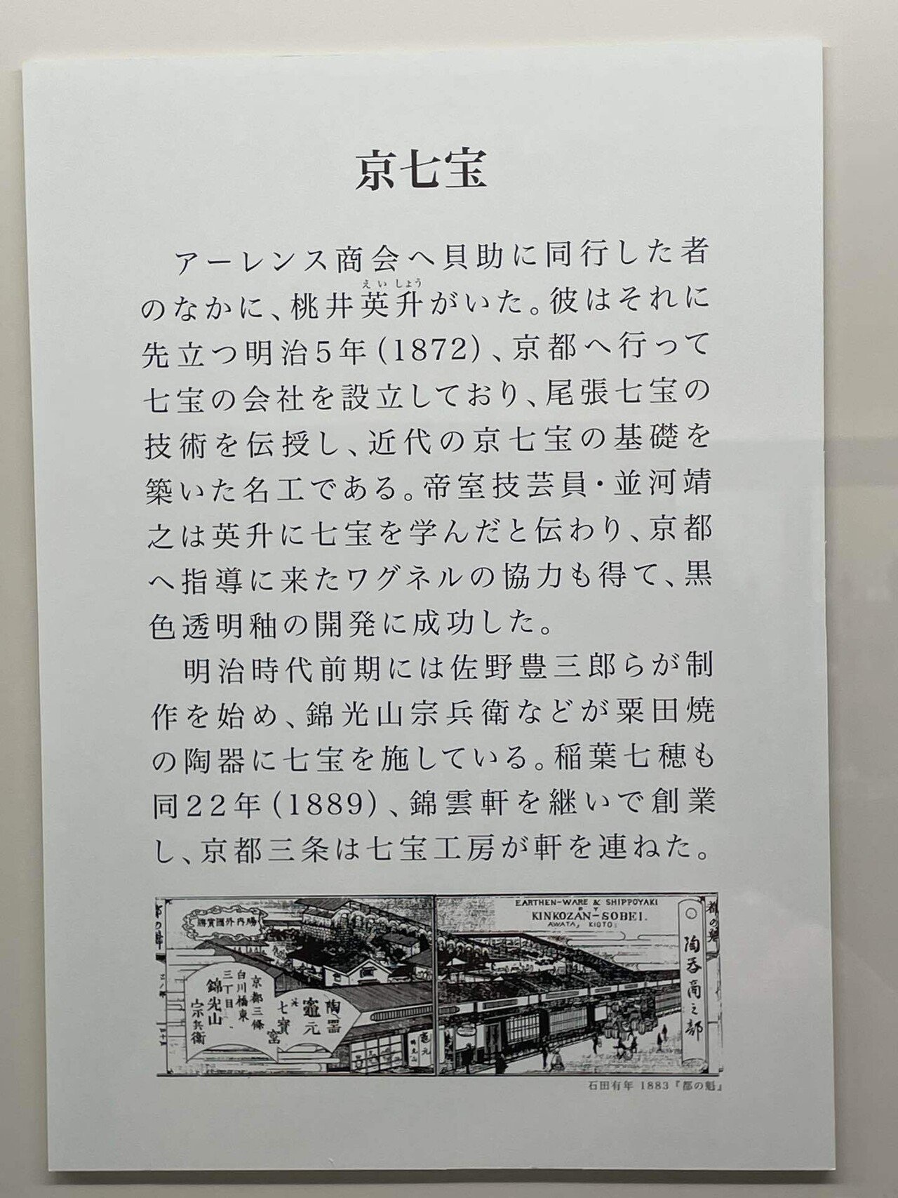 一方で、アーレンス商会へ塚本貝助に同行した者のなかに桃井英升がいて、彼は明治5年(1872)に京都へ行って七宝の会社を設立、尾張七宝の技術を伝授、並河靖之は桃井英升に学び、京都の舎密局に勤めていたドイツ人化学者のワグネルの協力で黒色透明釉の開発に成功したと言います。