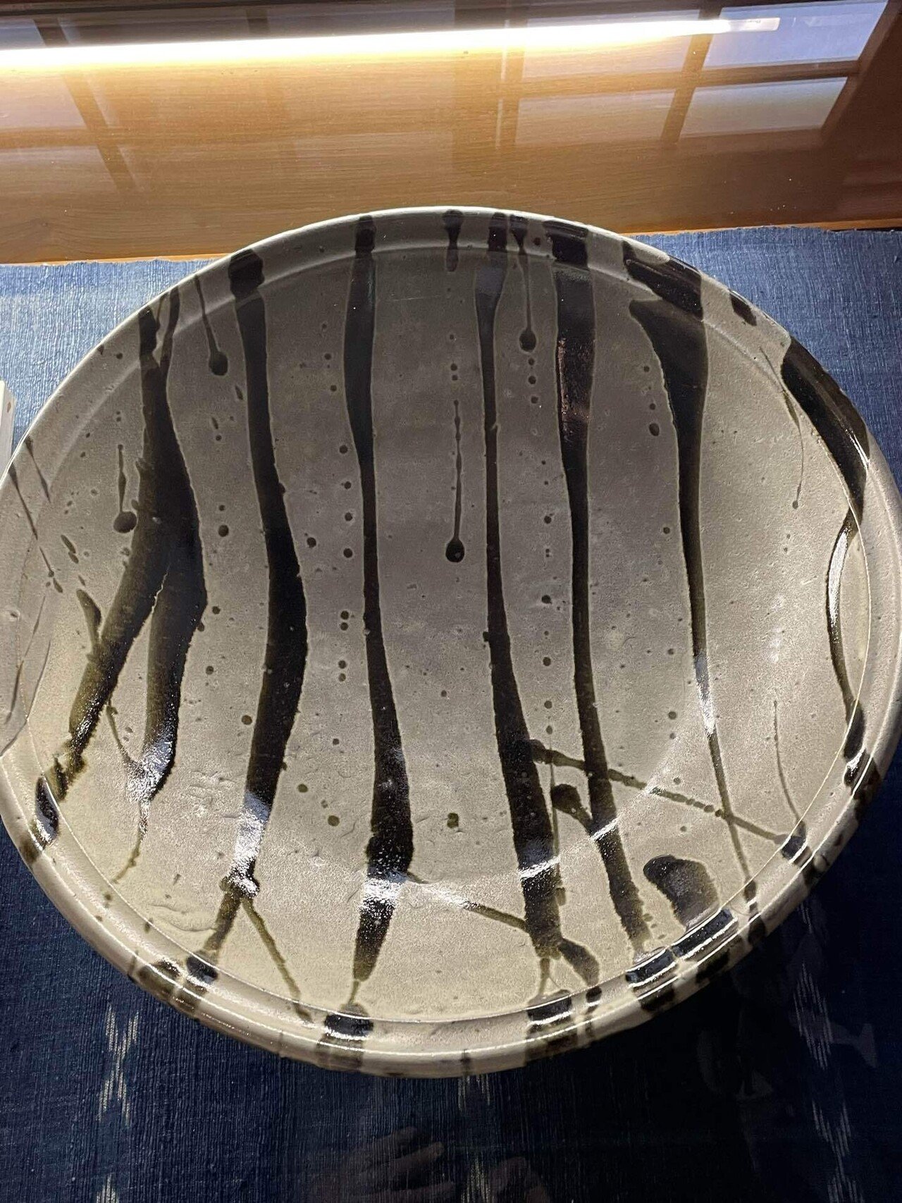 そして何と言っても濱田庄司の特徴は、釉を流し掛けして文様を描くことです。濱田が十五秒くらいで大皿に釉を掛けているのを見て、どうしてそんなに速くできるのか尋ねられた時に、濱田は「それは十五秒プラス六十年」と応え、結局六十年間体で鍛えた手さばきの業によるのだ、と述べているそうです。