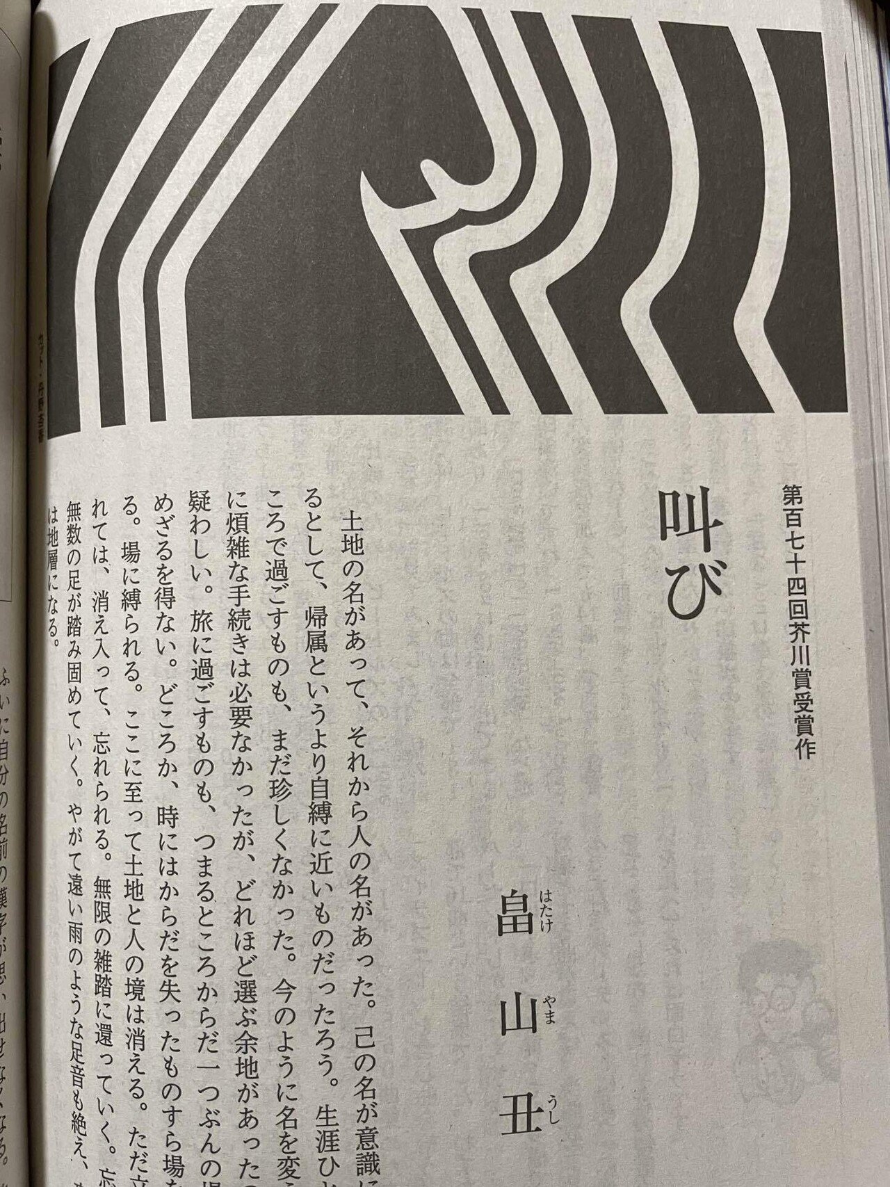 芥川賞を受賞した畠山丑雄の「叫び」を読みました。読んでみて、この作者の時空を結びつける構想力と筆力には確かなものがあると思いました。