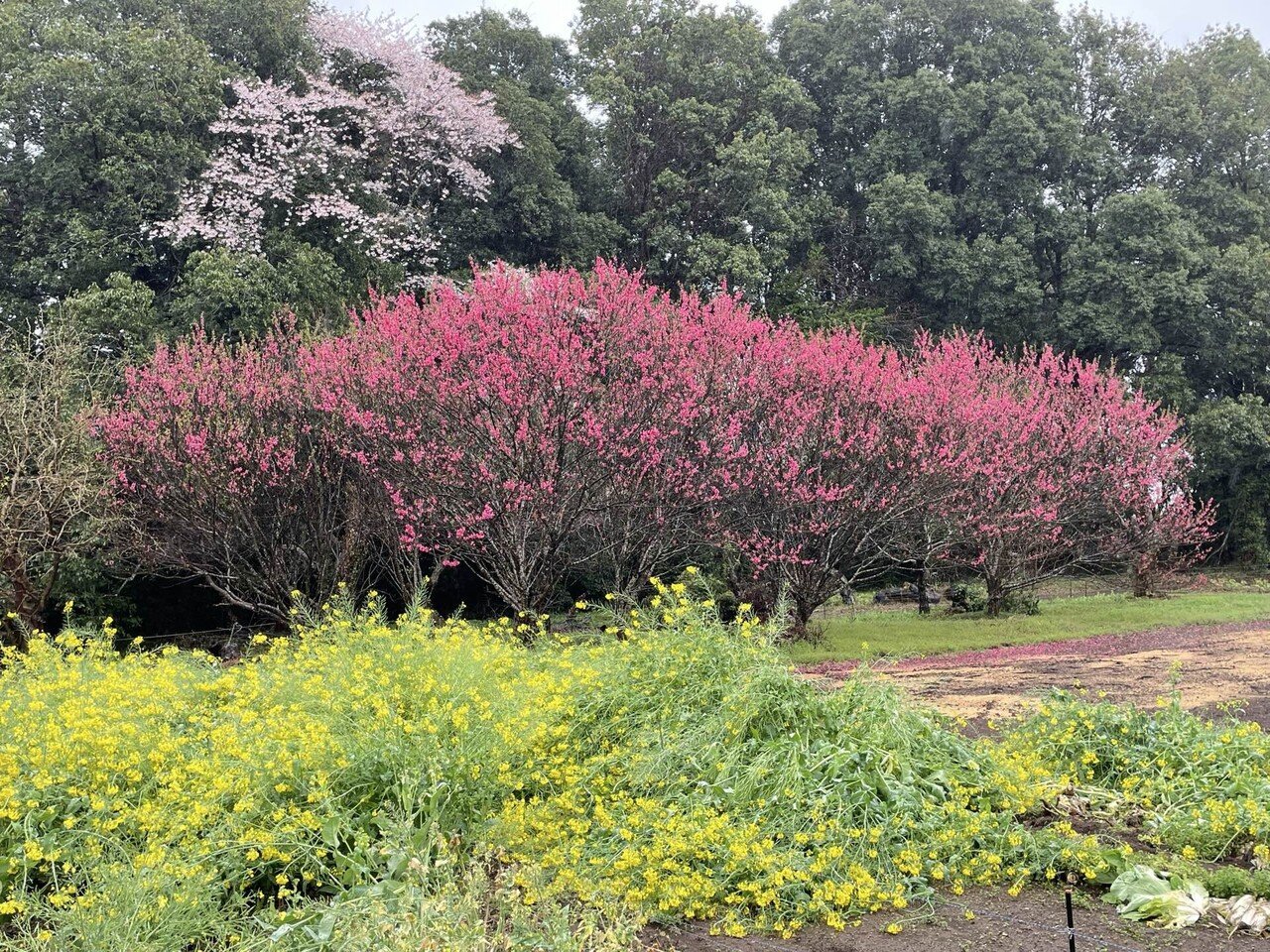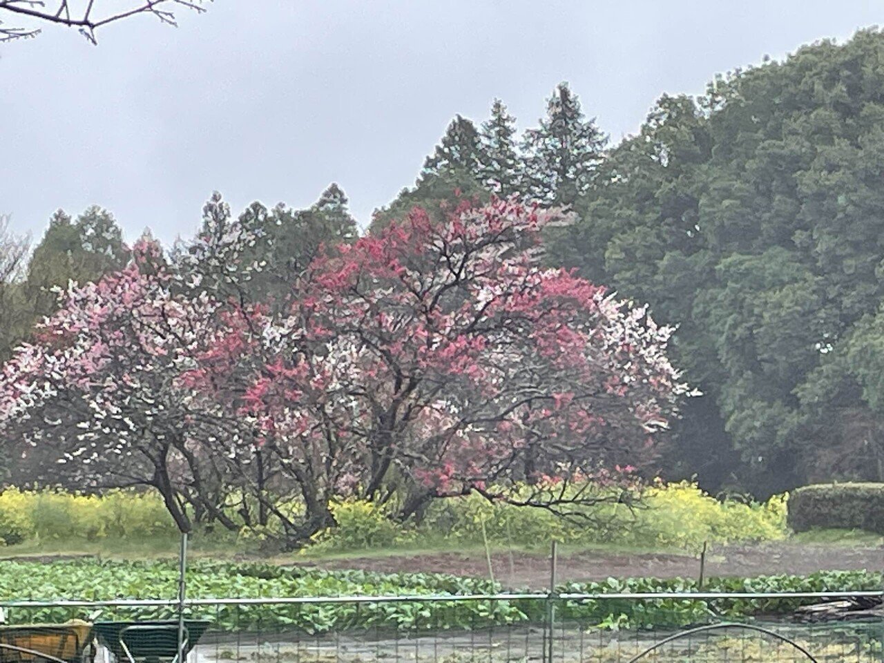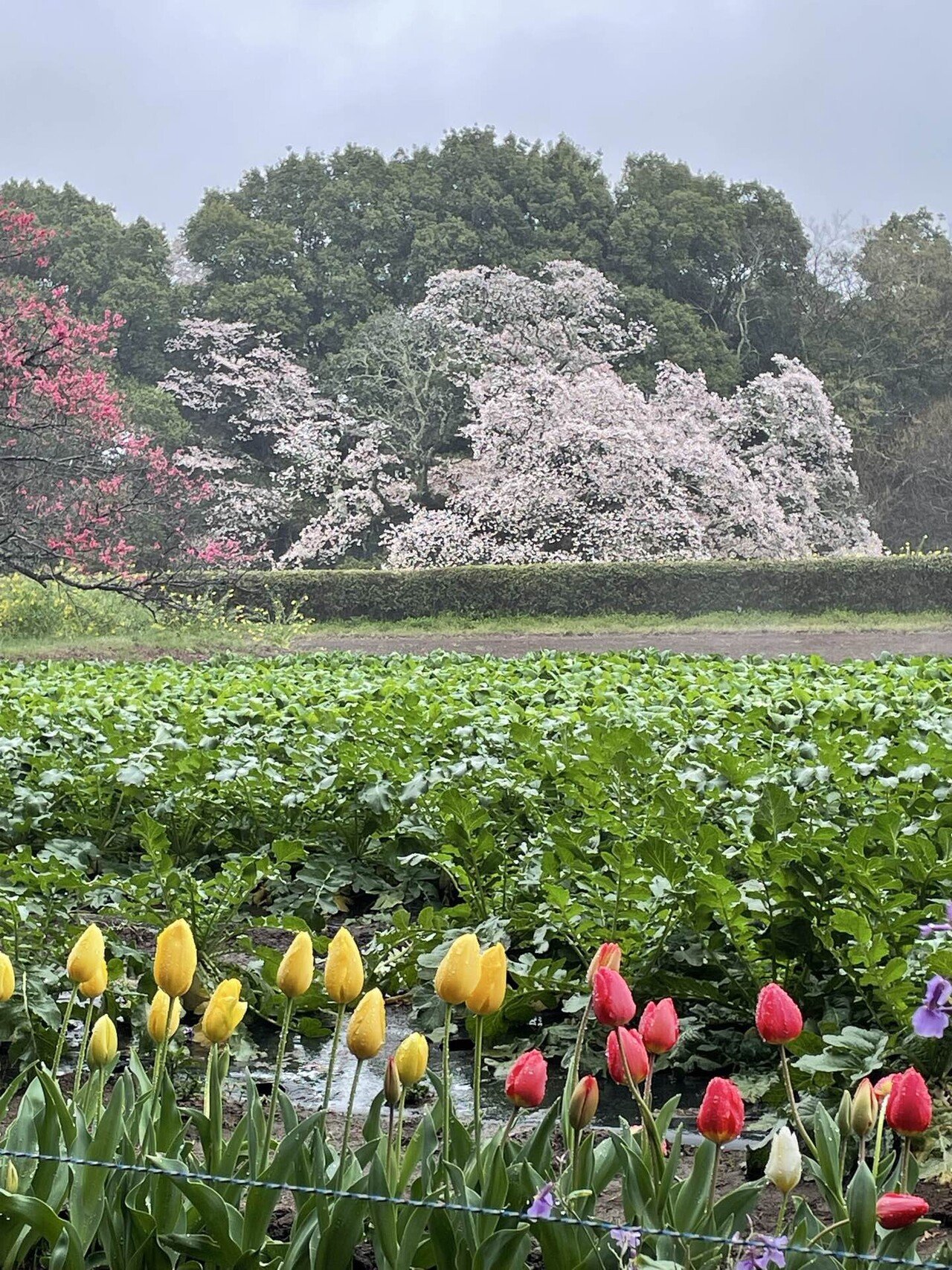 さて、かなりバスに乗ってから下車し、しとしと雨の降りしきるなか、花見に行くらしい5、6名の人々のあとについて、田舎道を歩いていきますと、畑ごしにさくらが見えてきました。さくらだけでなく、赤い花の桃の木も見えます。畑にはチューリップも植えられていました。