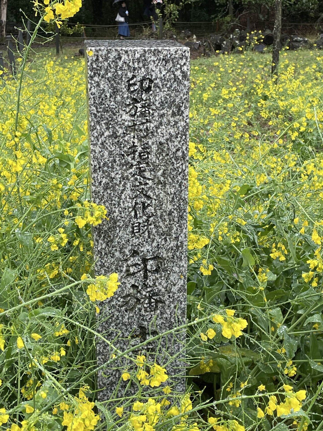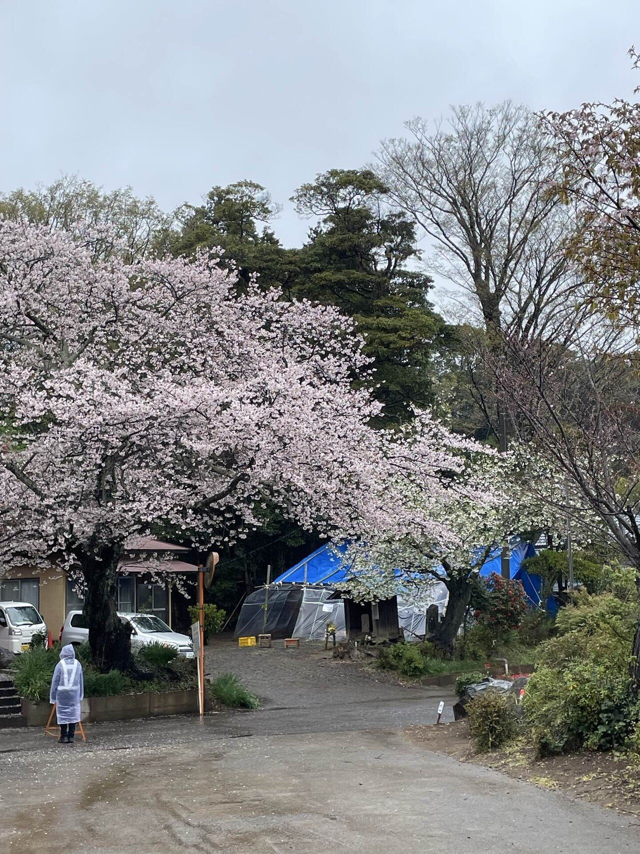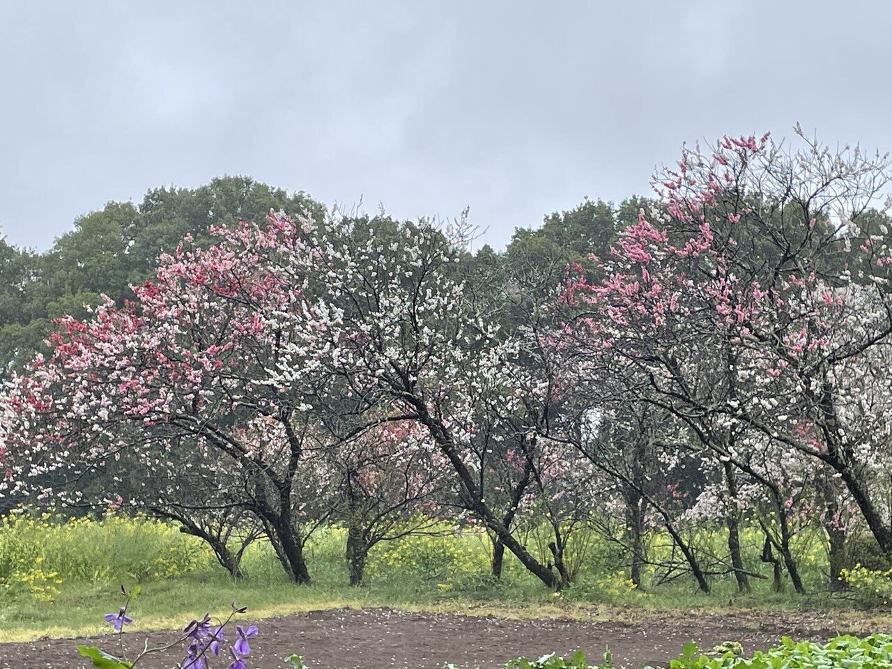 さて、かなりバスに乗ってから下車し、しとしと雨の降りしきるなか、花見に行くらしい5、6名の人々のあとについて、田舎道を歩いていきますと、畑ごしにさくらが見えてきました。さくらだけでなく、赤い花の桃の木も見えます。畑にはチューリップも植えられていました。