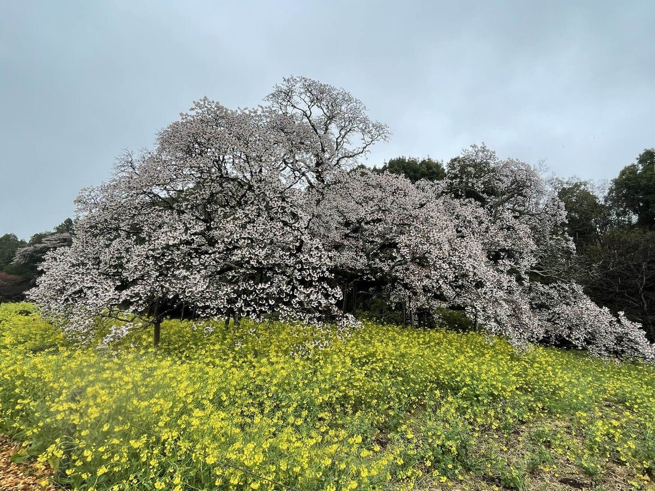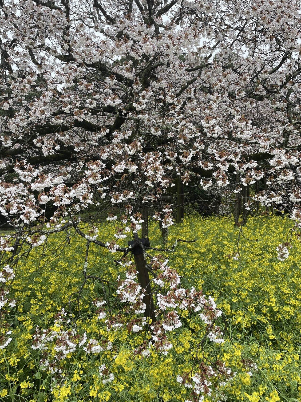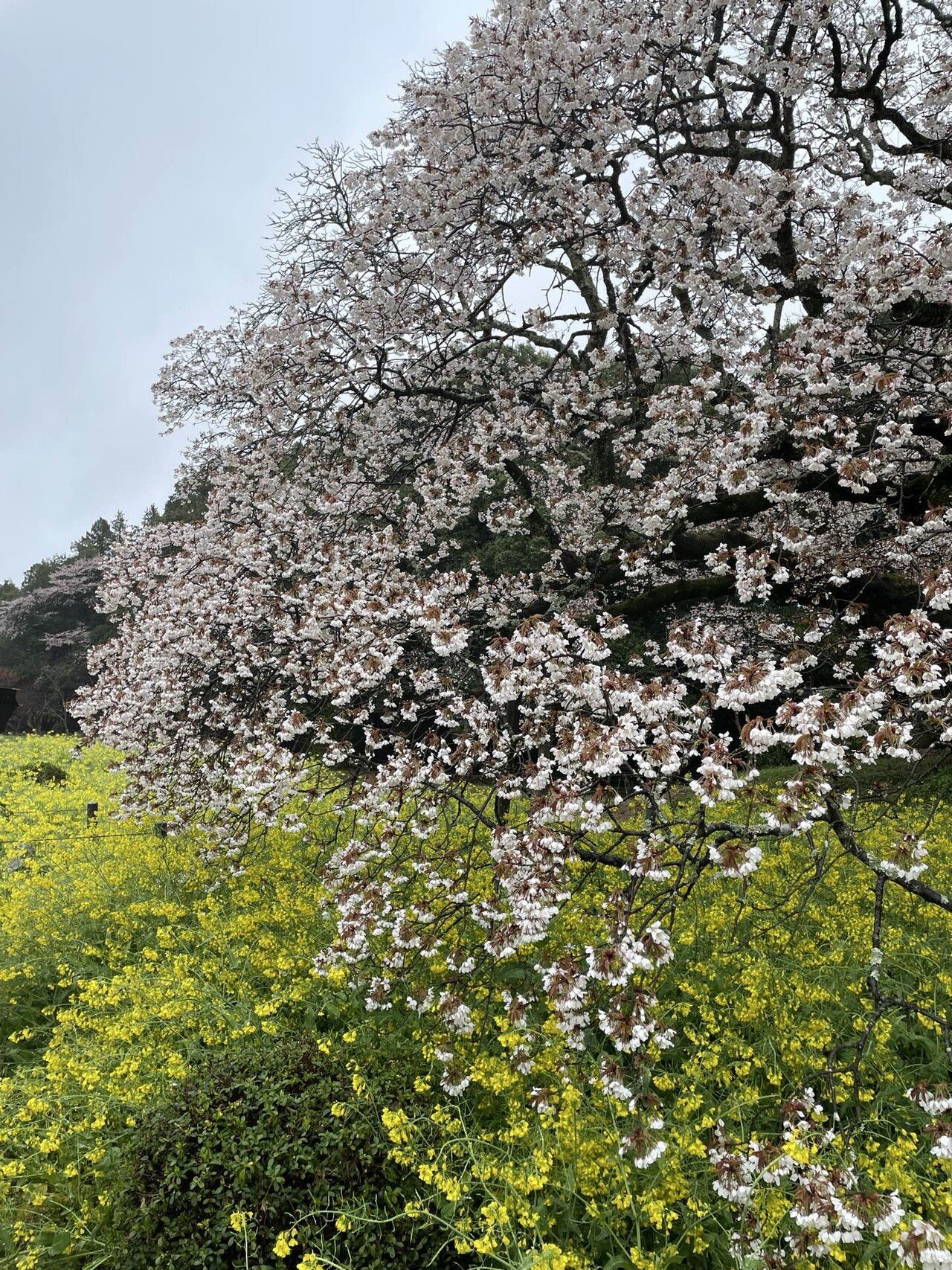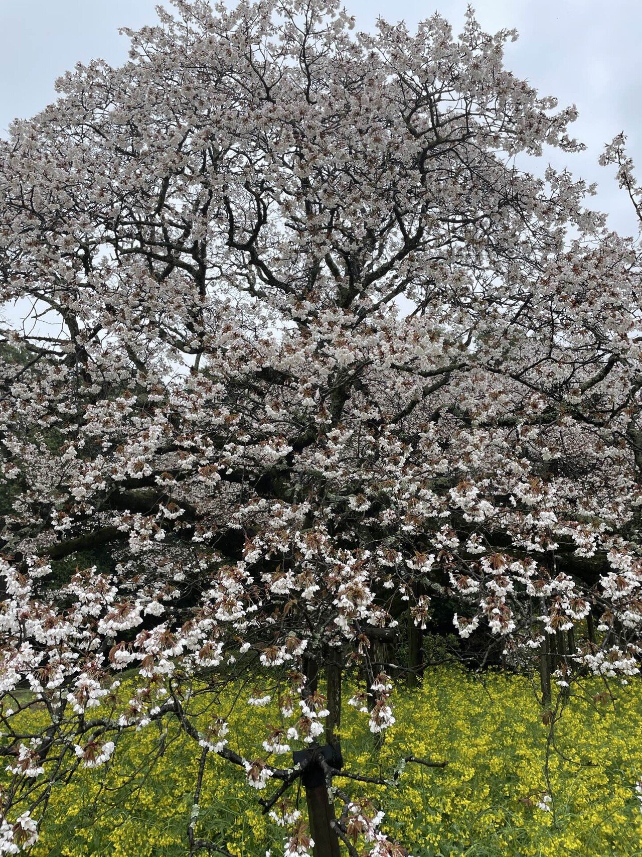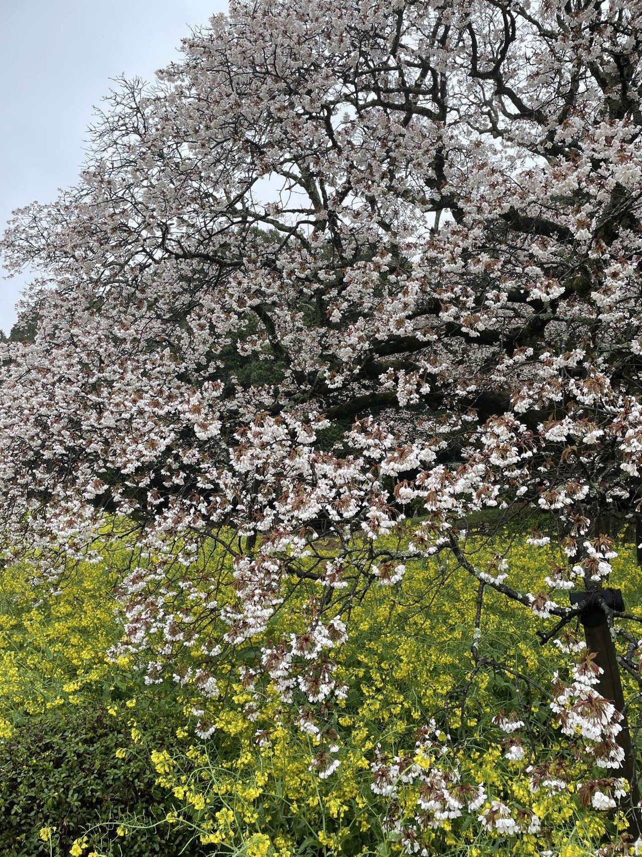 少しぬかるんだ土の道を巡って、さくらに近づいていきますと、枝を大きく広げて、黄色の菜の花越しに、まるで降りしきる雪が積もったようにこんもりと、真っ白いさくらが咲いているではありませんか。