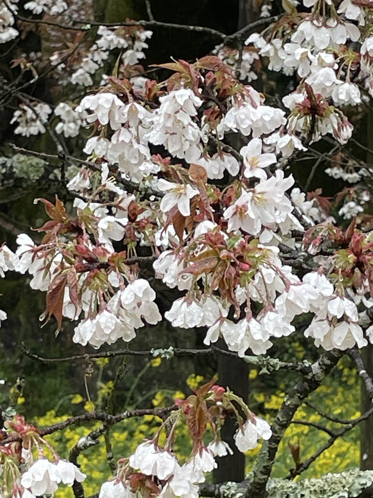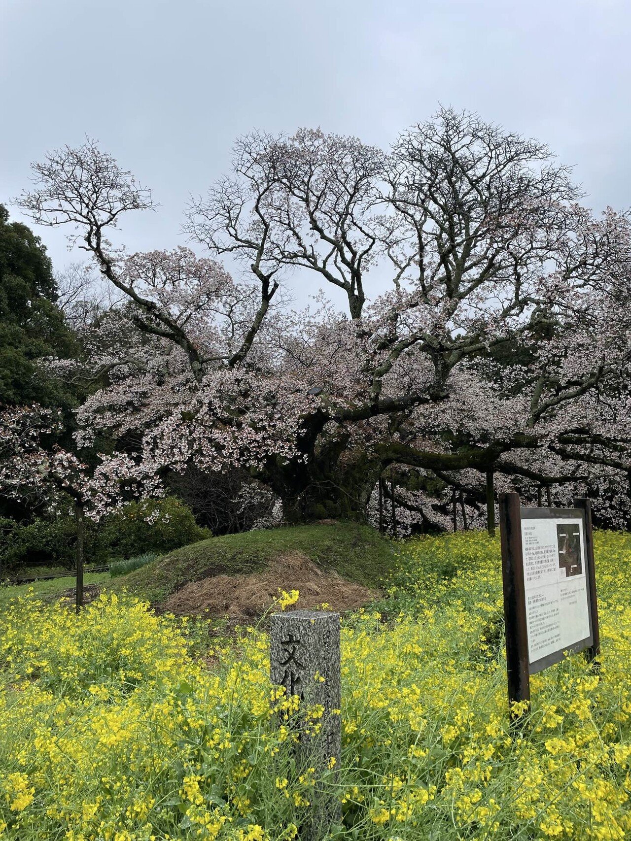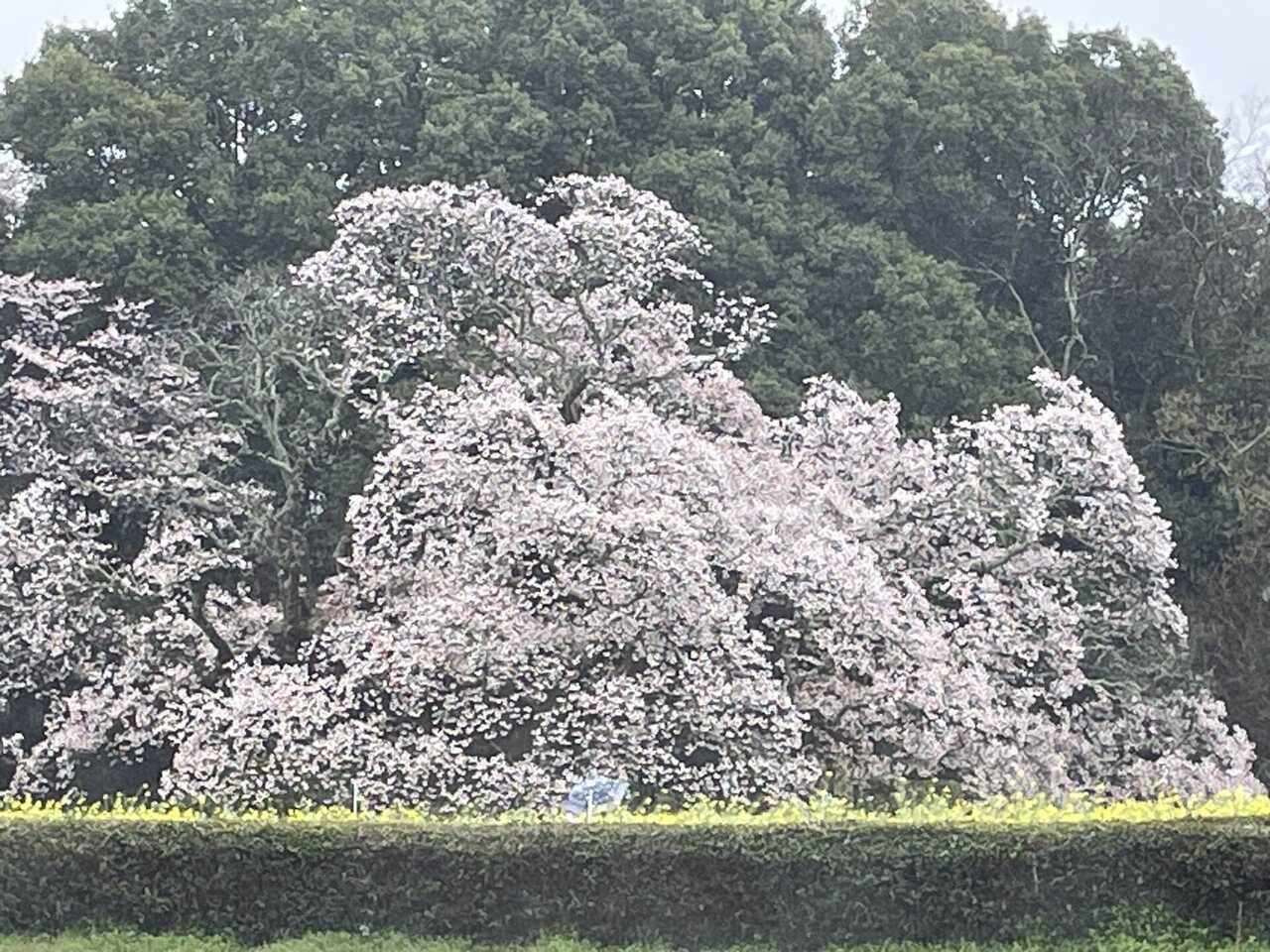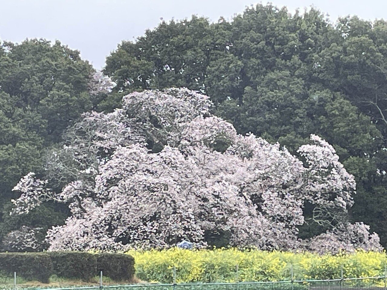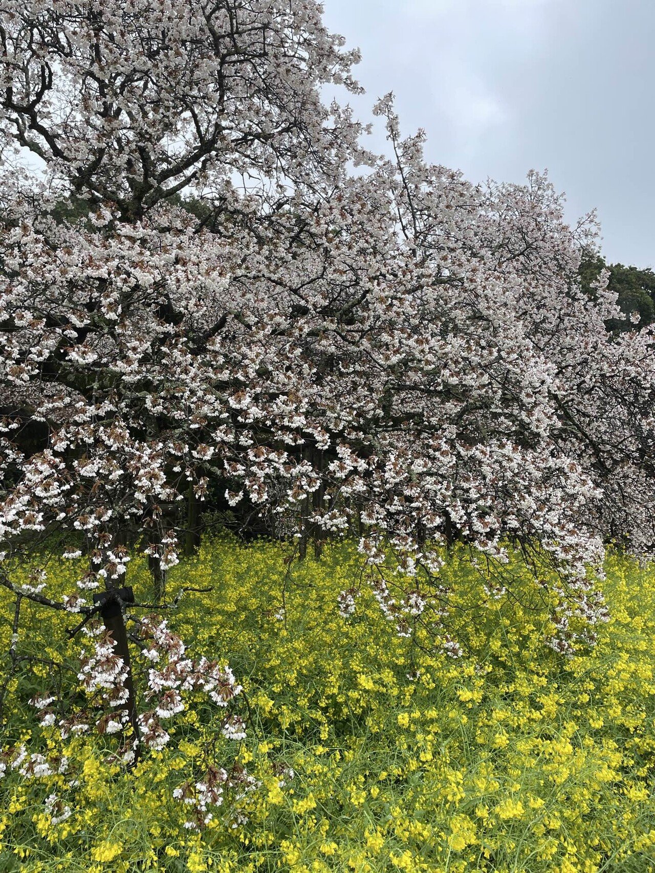 少しぬかるんだ土の道を巡って、さくらに近づいていきますと、枝を大きく広げて、黄色の菜の花越しに、まるで降りしきる雪が積もったようにこんもりと、真っ白いさくらが咲いているではありませんか。