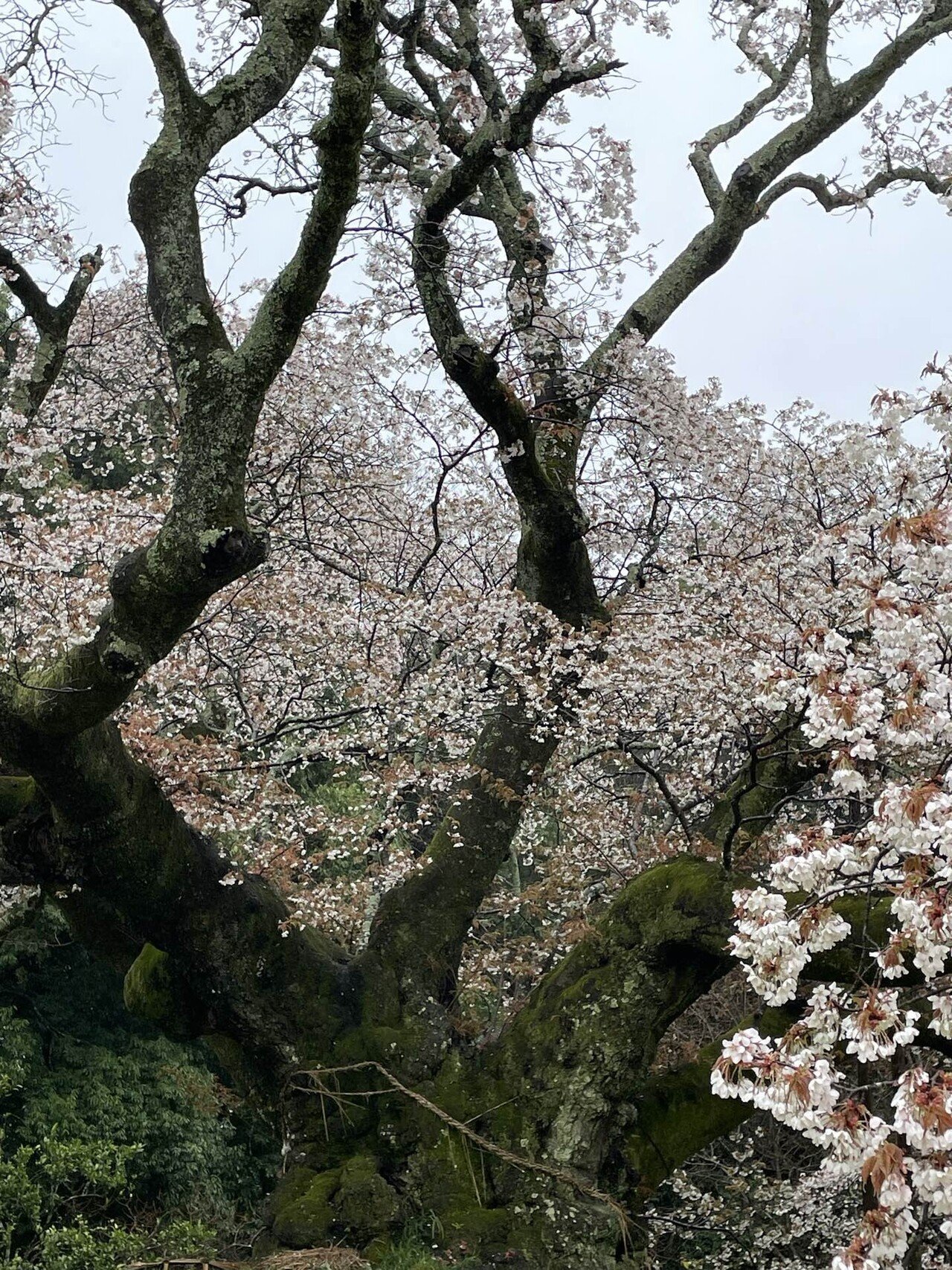 さらに近づいていきますと、少し盛り上がった土盛に土台となる苔むした太い幹が堂々と植えられており、さらに見事な太い枝が大きく翼を広げるように伸びているのです。枝に一面に咲いている、さくらの花をよく見ますと、花のすぐそばの花卉に薄紅色の若葉がついています。